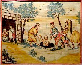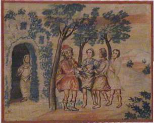 Im Hain Mämre sagen 3 Männer Abraham und Sara Isaäks Geburt an.