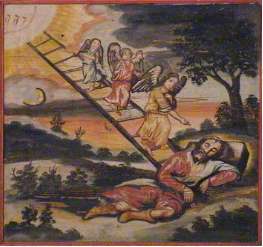 Und Jacob zog aus von Bersaba und kam an einem Ort, da blieb er über Nacht, denn die Sonne war untergegangen. Und er nahm einen Stein des Orts, und legte ihn zu seinen Haupte, undlegte sich an den selbigen Ort schlafen. Und ihm träumte, und siehe, eine Leiter stand auf Erden, die reichte mit der Spitze an den Himmel, und siehe die Engel Gottes fliegen dran auf und nieder, und der Herr stünd oben drauf. etc. (1. Mose 28, 10-13).