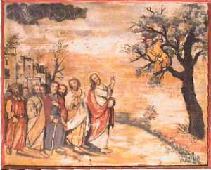 Da Jesu zu Jericho hinzog, siehe, da war ein Mann, genannt Zachäus der war ein Oberster der Zöllner, und war reich; Und er begehrte, Jesus zu sehen, wer er wäre, und konnte nicht vor dem Volk, denn er war klein von Person, und er lief vorhin, und stieg auf einen Maulbeerbaum, auf das er ihn sähe, denn all da sollte er duchkommen. U. als da kam Jesus an die selbige Stätte, sah er auf und ward sein gewahr, u. sprach zu ihm: Zachäus steig eilend hernieder; denn ich muß heute zu deinem Haus einkehren. (Lukas 19,1-6).