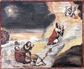 Und er riss sich von ihnen bei einem Steinwurf, und kniete nieder, betete, und sprach: Vater, willst du , so nimm diesen Kelch von mir; doch nicht mein sondern dein Wille geschehe. Es erschien ihm aber ein Engel vom Himmel, und stärkte ihn. Und es kam das er mit dem Tode rang, und betete heftiger. Es ward aber sein Schweiß wie Blutstropfen, die fielen auf die Erde. (Lukas 22,41-44).