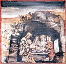 Danach bat Pilatum Josef von Arimathäa, das er möchte abnehmen den Leichnam Jesu. Und Pilatus erlaubte es. Deswegen kam er und nahm den Leichnam Jesu herab. Es kam aber auch Nicodemus und brachte Myrren und Aloen untereinander, bei hundert Pfunden.Da nahmen sie den Leichnam Jesu, und bunden ihn in Leinentücher mit ..... , wie die Juden pflegen zu begraben. Es war aber an der Sätte, der er gekreuzigt ward, ein Garten und im Garten ein neues Grab, in welches niemand je gelegt war. Daselbst hin legten sie Jesus, um des Ruhetags willen der Juden, dieweil das Grab nahe war. (Johannes 19,38-42).