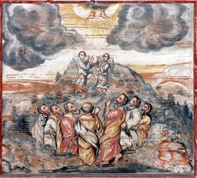 Da er solches gesagt, ward er aufgehoben zusehens, und eine Wolke nahm ihn auf, vor ihren Augen weg. Und als sie ihm nachsahen, gen Himmel fahrend, siehe da standen bei ihnen zwei Männer in weißen Kleidern welche auch sagten: Ihr Männer von Galliläa, was steht ihr und seht gen Himmel? Dieser Jesus, welcher von euch ist aufgenommen gen Himmel, wird kommen wie ihr ihn gesehen habt gen Himmel fahren. (Apostelgeschichte 1,9-11).